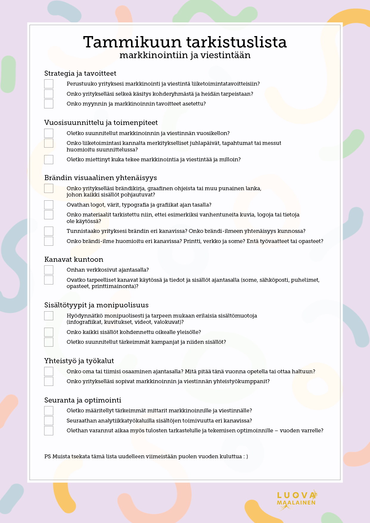Nappaa tästä talteen näppärä markkinoinnin tarkistuslista alkuvuoteen.